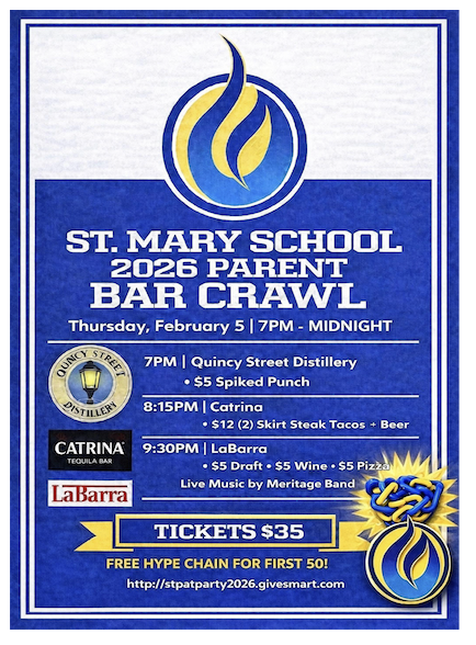 St. Mary School's annual fundraiser, The St. Pat's Party, is organized by parent volunteers and held in the school Parish Center. With the support of generous donors like you, this fundraiser allows St. Mary School to continue to invest in excellent educators, new technology and classroom tools, and keep tuition affordable for any child in our community.