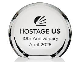 Created to honor a decade of impact, this bespoke Steuben Glass Halo Award captures the legacy of Hostage US in a form as enduring as the mission itself. Hand-polished from solid crystal and etched with the new Hostage US logo and anniversary inscription (April 2026), this 6-inch circlet radiates with clarity, meaning, and presence.