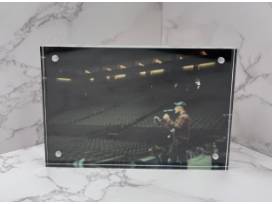 4"x6" photo in an acrylic block. Photograph taken by Pete Wentz, from his personal collection, of Patrick at soundcheck on tour in Spring of 2024. Handwritten note on back, signed. 1/1.