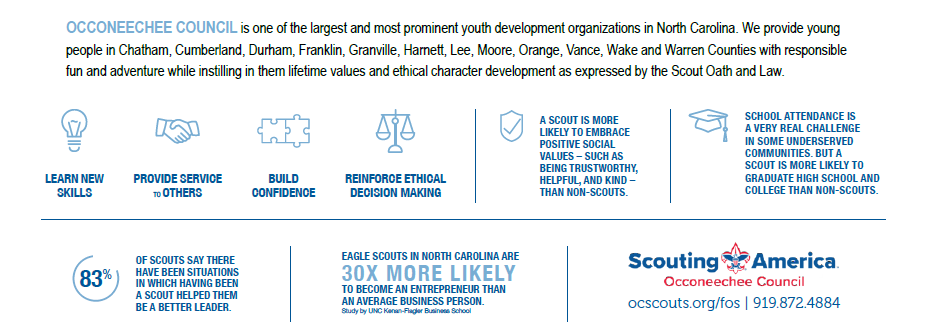 THE GOAL OF THIS EVENT is to bring our extended top leaders in the Chapel Hill community together to honor an extraordinary leader in Chapel Hill and raise funds to support Scouting programs that develop character, citizenship, leadership, patriotism, self-reliance and personal fitness in both the Chapel Hill community and in Orange County.