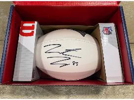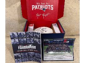 New England Patriots 2025 Season Fan Collection includes an official NFL football personally signed by Hunter Henry, 2025 New England Patriots team photo, authentic Gillette stadium playoff rally towel and the "we are all Patriots" book. All items are presented in a Patriots branded collectors box.