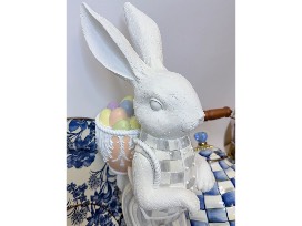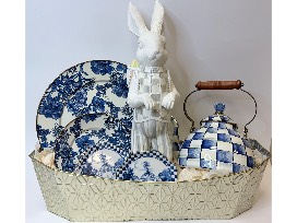 This beautiful offering from Louis Anthony Jewelers is filled with some incredible MacKenzie-Childs items. Four Royal Toile small plates, an English Garden Enamel platter and dinner plate, and the Royal Check tea Kettle. The MacKenzie Childs Cameo Tabletop bunny with a backpack of eggs finishes off this beautiful basket. MacKenzie-Childs is a