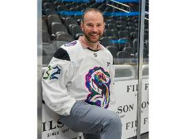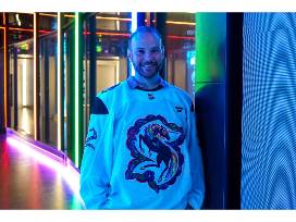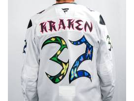 Crested with "ROGERS" and "32," this size 54, Made in Canada jersey was worn and signed by Seattle Kraken Head Athletic Trainer Justin Rogers, MEd, LAT, ATC, the first openly gay support staff member on an NHL bench. Specialty Kraken Jersey designed by Vegas Vecchio in honor of Pride Night on January 8, 2026.
