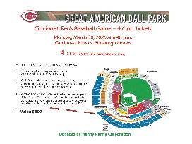 Step up to the plate for an unforgettable night at the ballpark! This package includes four Club Level tickets to the Cincinnati Reds game on Monday, March 30 at 6:40 pm - plus parking for a hassle-free arrival.