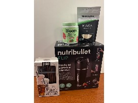 Fuel your day the healthy way. This wellness bundle features a powerful Nutribullet Flip portable blender, superfood supplements, convenient single-serve protein mixes, and reusable stainless steel straws - perfect for smoothies and shakes on the go.