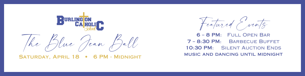 The Blue Jean Ball is an annual dinner and auction event that serves as the largest source of fundraising revenue for Burlington Catholic School. The event is taking place at The Landing at 1841 and features dinner provided by Stowell's Catering, music, silent auction, and several raffle opportunities. If you are not able to attend the event in person, you can still participate in the silent auction, tuition credit and 50/50 raffles through this website.