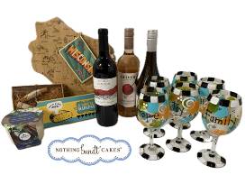 Impress your guests with this package that will make you the host with the most! Includes a 12" x 13" laser-etched Destination Wisconsin bamboo cutting and serving board, a gift certificate from Nothing Bundt Cakes in Brookfield (good for a free 10" decorated cake, expires September 9, 2026, valid only at Brookfield location), a 6.8 oz 3-wick Glade Sheer Vanilla Embrace candle, a 750 mL bottle of 2024 Chalk Hill Chardonnay, a 750 mL bottle of 2023 Pierce Canyon Reserve Cabernet Sauvignon, a 750 mL bottle of Oliver Winery Cherry Moscato, six whimsical hand-painted wine glasses each with a different saying: Hope, Joy, Peace, Family, Faith, Love, a handmade Lappituote Nordic corkscrew and bottle opening set and a 6 pc set of Cheese Barrel markers that include Blue, Brie, Gouda, Swiss, Goat and Cheddar.