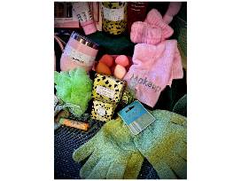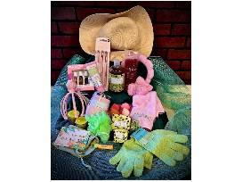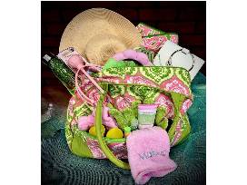 Travel Bag includes hat, exfoliating gloves, wine tumbler, earrings, head band, make up sponges with holder, candles, Burt's Bees lip balm, cucumber olive oil soap & body wash and lotions.