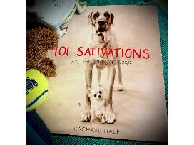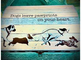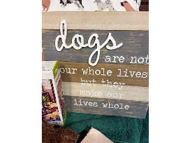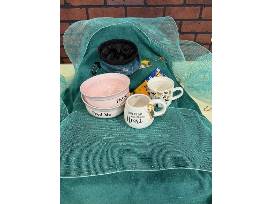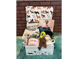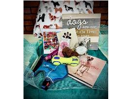 Box filled with food & water bowls, dog themed mug, plush toys, harness & collar, dog pillow, dog picture frame, 101 Salivations book, puzzle, signs& adorable leash hanger.