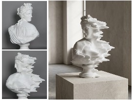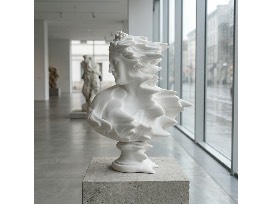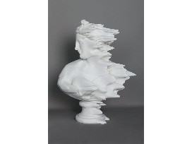 The work embodies Caillard's signature dialogue between past, present, and future. From one angle, a pristine neoclassical bust emerges in exquisite detail; from another, the figure dissolves into cascading waves, evoking both digital glitches and the erosion of millennia compressed into a single frozen moment.