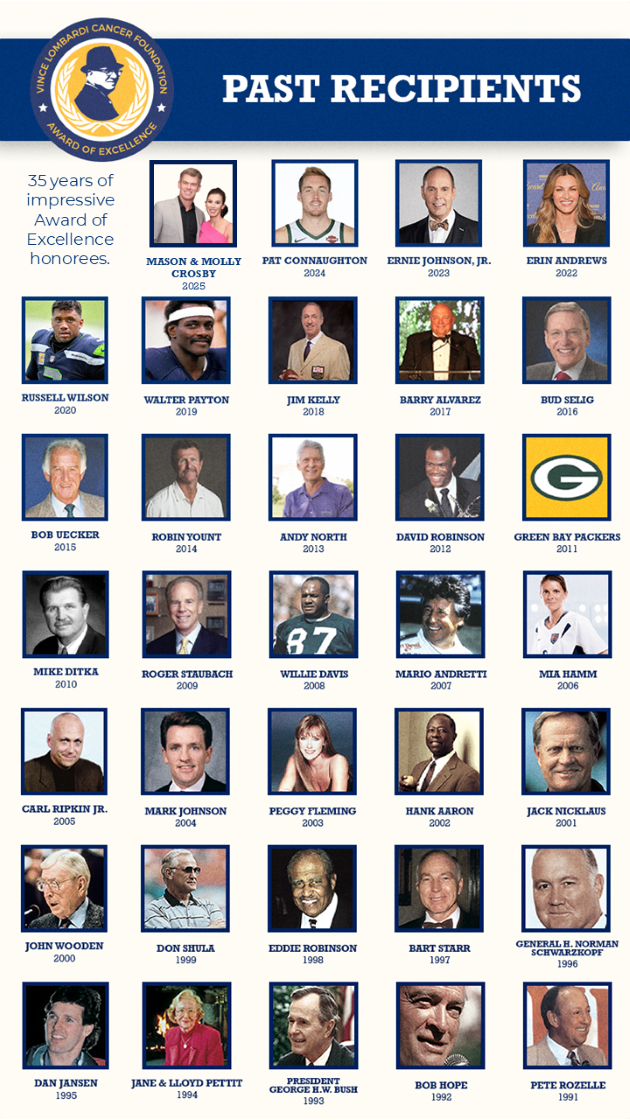 The Annual Vince Lombardi Award of Excellence Dinner recognizes those who capture the spirit of commitment and pursuit of excellence that define legendary Green Bay Packers Coach Vince Lombardi. This year's Award of Excellence honoree, the Milwaukee Brewers, and Champion for a Cure awardee, Cecelia Gore, are fueled by the same desire as event attendees and the Vince Lombardi Cancer Foundation to prevent cancer, provide the best care to those fighting it, and find a cure.