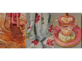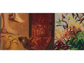 In this body of work I start compositions with a grid. This allows me to employ elements central to the content of my work: juxtaposition of landscape and still life; drawing from the history of art; drawing from the conceptual history of taxonomy and collection; playing with a pre-scientific taxonomy of resemblance; exploring the overlap between natural form, fine art, and decorative arts. The grid gives me the freedom to use a less literal space, one that can become more abstract, and which fits into my continuing attraction to shallow spaces.