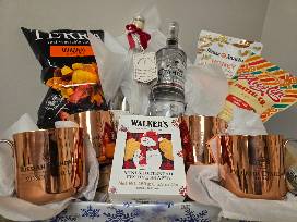 This item is paired with a set of four (4) copper Moscow Mule Mugs and assorted snacks. Enjoy!