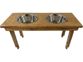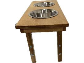 Give your dog the comfort they deserve with this beautifully crafted, one-of-a-kind adjustable-height ergonomic feeder, custom-built for medium to large dogs. Designed with both function and style in mind, this feeder is perfect for reducing neck strain and promoting healthier posture during mealtime. The legs are made of pine the braces are made of poplar. You can also gift your pup a 12" x 13" Bark felt, round toy bin grey, a Kong Cozie alligator toy, a Kong, a plush snowman and Santa toy, a plush bird toy and a ChuckIt! Kick ball!