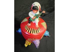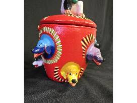 Vibrant and bold, this dog pottery by artist Gerardo Ortega blends playful imagination and dog motifs! Bring this creative piece into your home and make it the perfect accent piece, whether it's a treat jar for your furry best friend or just for looks.
