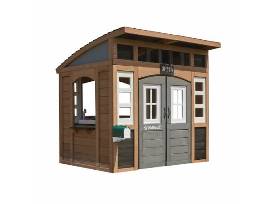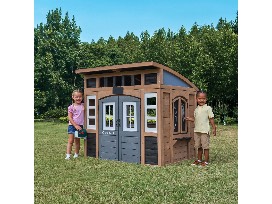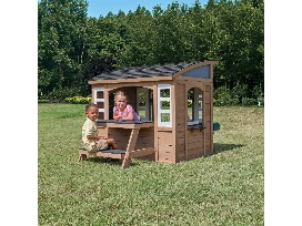 The KidKraft Sunny & Bluff Playhouse - premium cedar wood outdoor playhouse. It features an arched roof, built-in kitchen (sink, burner, accessories), attached picnic table with bench, and interactive chalkboard shutters for creative, imaginative play. Designed for durability and ventilation, it includes numerous windows and a mailbox.