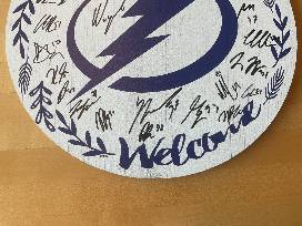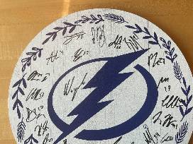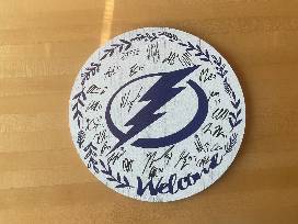 Circular decorative sign signed by members of the 2025-26 Tampa Bay Lightning. Dimensions: 12 Inch circumference.