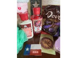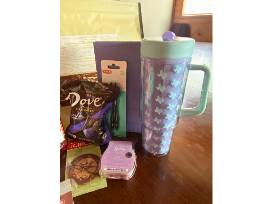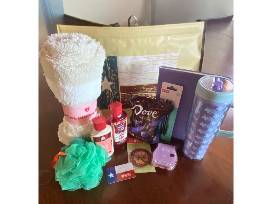 All Y'all Need is Comfort Gift Basket includes a cozy blanket, tumbler, Bath and Body Works body lotion and body wash, candy, loofa, notebook, pens, and a HEB gift card ($25) in a Texas shopping bag.