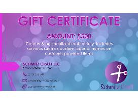 Bring your logo to life with this $500 gift certificate to Schmitz Craft! Whether you're outfitting a business, team, ministry, or family event, this certificate includes professional logo digitizing and expert embroidery on any approved customer-provided items.