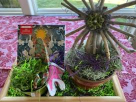 The hand-crafted wooden garden planter includes a 1000 piece garden puzzle, yard art and pot with garden gloves and tools.