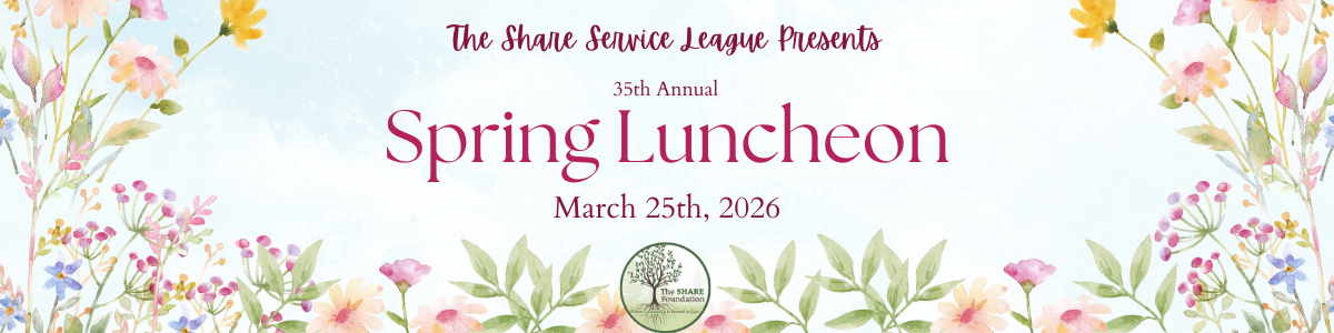 Enjoy a beautiful day with friends while supporting the SHARE Foundation! The Spring Luncheon features a delicious meal, cash bar, a variety of door prizes, basket raffles, entertainment by the Sharing Meadows Villagers, and the opportunity to purchase unique handmade items crafted by our Villagers.