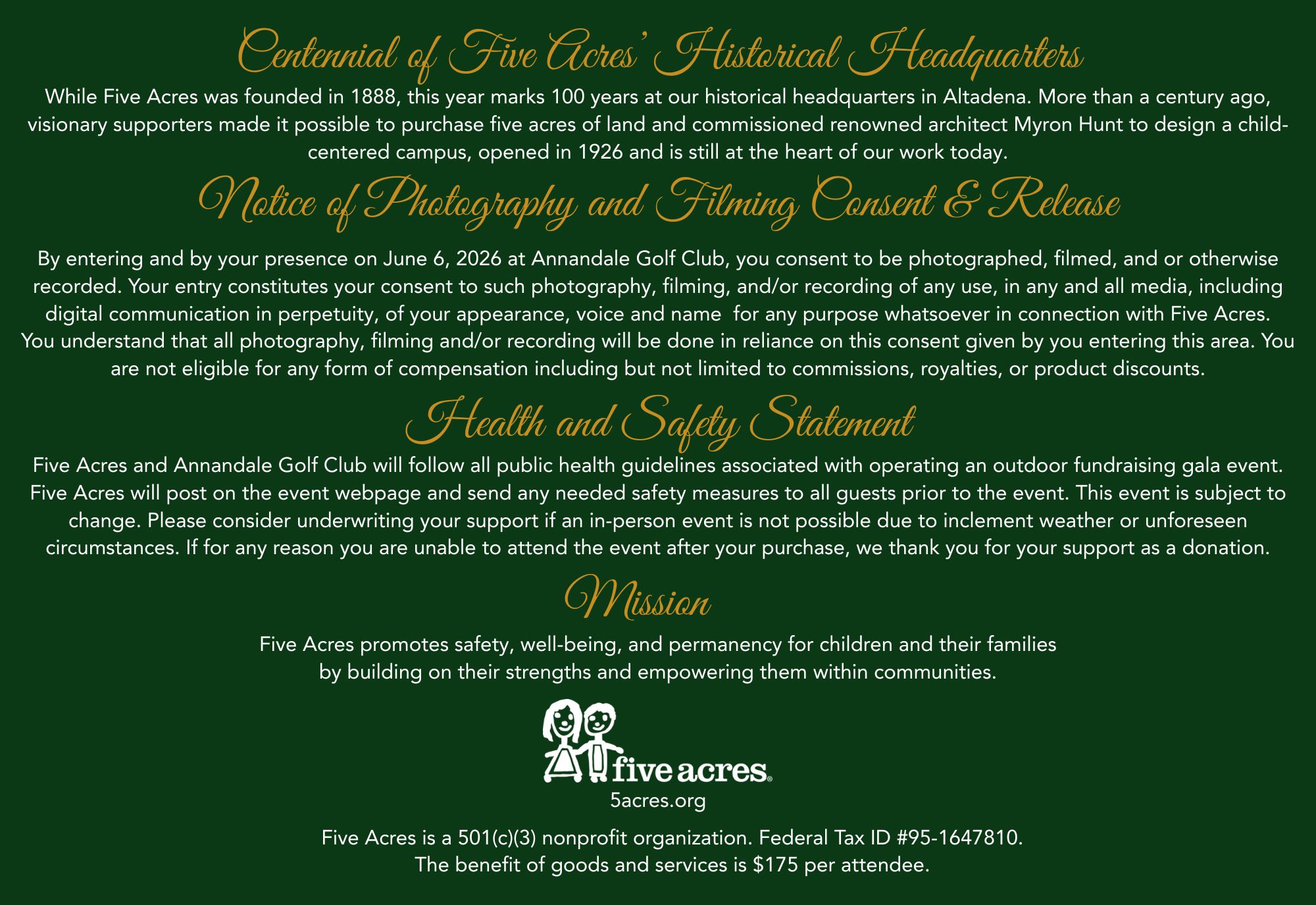- Recognition on printed invitations*, Five Acres event webpage, press release mentions, logo inclusion on event day presentations, and name recognition on stage during the event