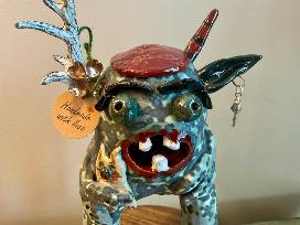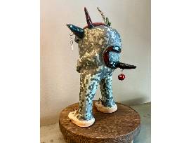 This cat loving monster loves his feline friend and even wears cat slippers! Note the adorable mouse earring. Very detailed and FUN! Created specifically for Furkids by a local artist.