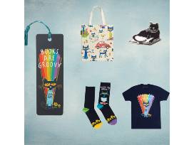 Calling all bookworms! Enjoy one book per month for a whole year with a subscription to Book of the Month. Let everyone know you're a book lover with swag from Out of Print, including a Pete the Cat tee, tote, socks, bookmark and a bookstore cat pin.