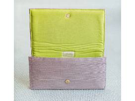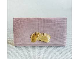 Emily's love of design and interiors comes full circle with this clutch made from lavender Thibaut grasscloth wallpaper. It is adorned with an elegant pair of golden ginkgo leaves, and the interior is lined with lime green linen. The clutch contains accordion sides with grommets for an optional chain (chain sold separately). Overall dimensions are 12" x 7" with a magnetic snap closure.