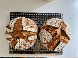 You will receive two 2-pound loaves of homemade whole wheat sourdough bread, delivered fresh to your home. These breads are baked from a sourdough starter that has been carefully maintained for over 10 years, giving the bread a rich flavor and distinctive character.