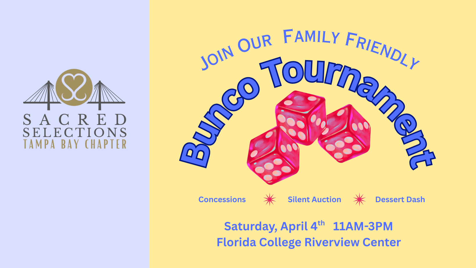 You can still participate in the auction!Join the Sacred Selections Tampa Bay Chapter for a fun, family friendly afternoon as we celebrate and support the blessing of adoption. with a Bunco Tournament - a simple, exciting game that's fun for all ages. This event also features a Dessert Dash, Silent Auction, Sacred Selections merchandise, and concessions stand.