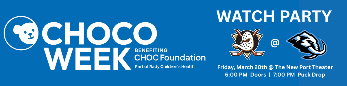 Join the Anaheim Lady Ducks (wives and significant others of Ducks players) and fellow fans at the Port Theater in Corona Del Mar for a CHOCO Week themed watch party featuring music, food, drinks, silent auction, opportunity drawings, and even Wild Wing shaped cotton candy. Attendees will also be able to purchase and receive their CHOCO Bears before the general public, and those who make at least a $20 donation will receive an 8" mini CHOCO Bear as a thank you!