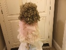 This Victorian doll has blue eyes and dark blond hair. Her dress is peach with a lace-hemmed layer on top of a peach taffeta under layer and heavy petticoat. She has cream, lace-lined bloomers and white tights. She is from the Treasury Collection Paradise Galleries and is 24 inches tall.