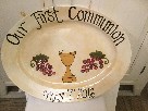 Remember your child's First Holy Communion with this priceless keepsake. Designed, painted and signed by the students of Mrs. Grannemann's class, this platter will make a beautiful centerpiece for your Communion celebration and will be cherished for years to come. The platter is food safe. Item also includes a gift card to Fresh Thyme Market.