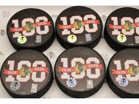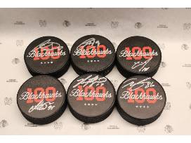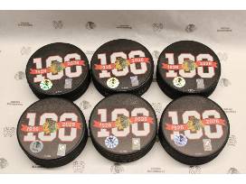 Set of 6 Autographed Centennial '100' Logo Blackhawks Pucks
