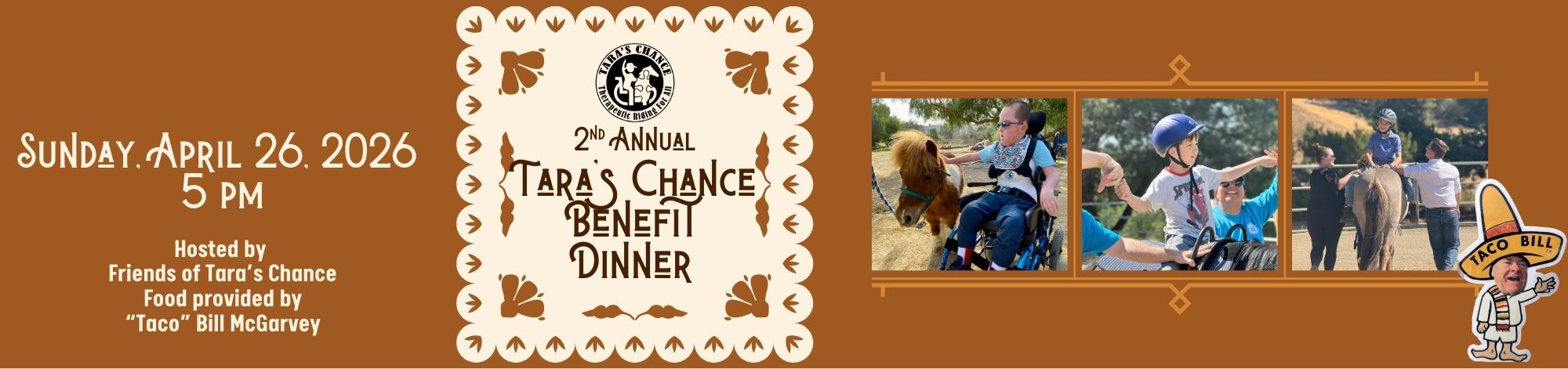 Tickets include a taco dinner, beer and beverages, photos with Ryan the horse, and an inspiring program centered on our mission. Come celebrate our riders, horses, and the incredible community that makes Tara's Chance possible.
