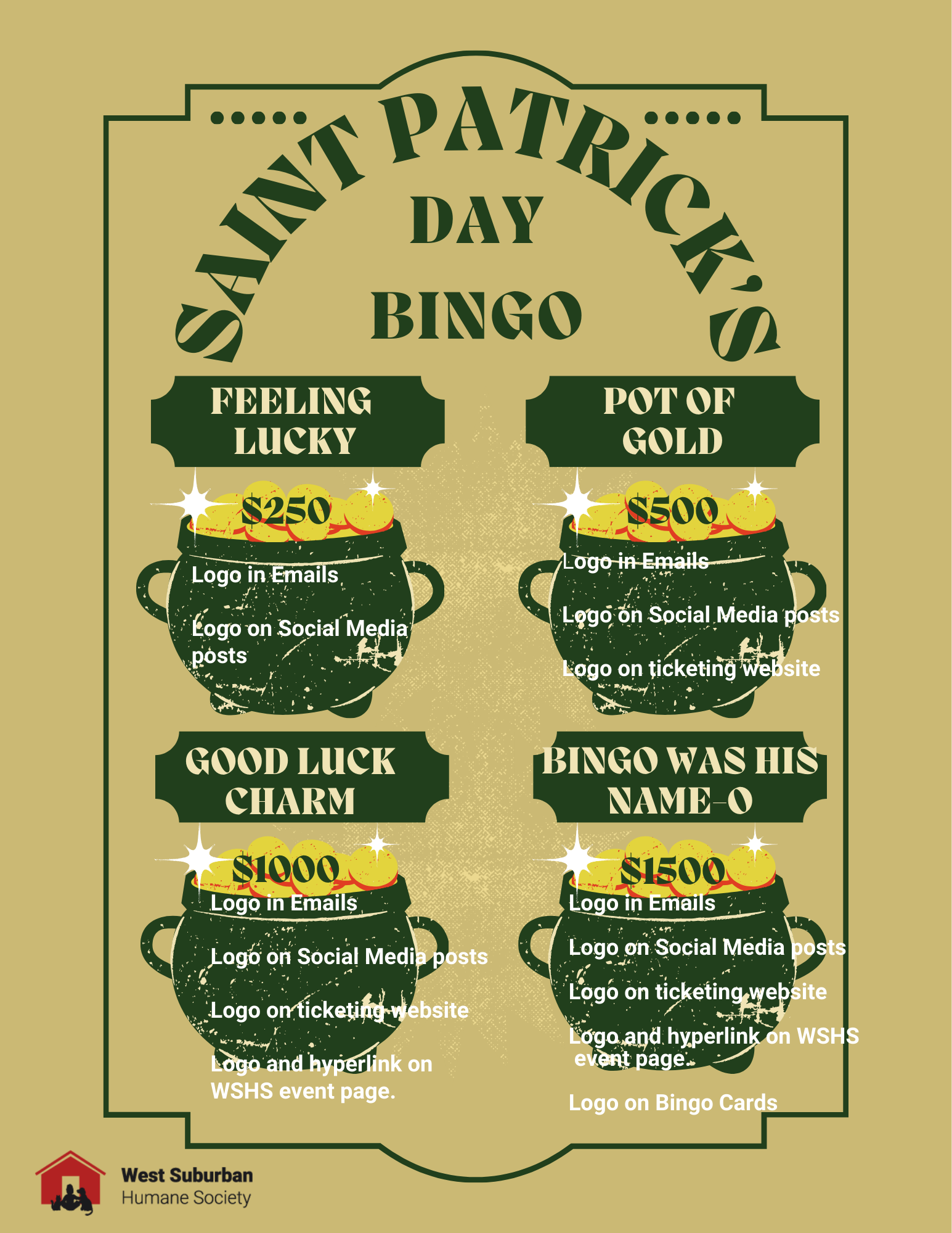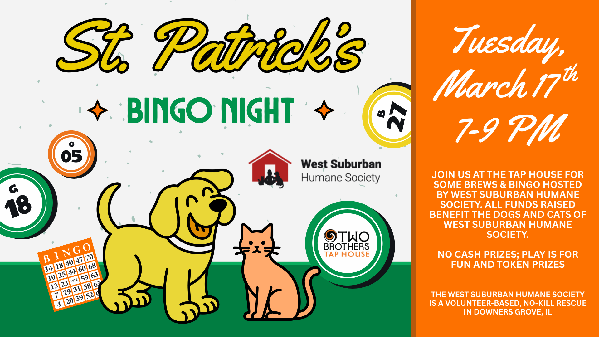 Join us for a fun night of St. Patrick's Day Bingo to benefit the dogs and cats of WSHS!