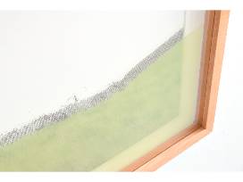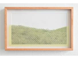 This unique work, from a series called Rainy Season, explores landscape through layering and framing. A print on the inside of the acrylic glass floats above a print on paper, aligning and misaligning as the viewer moves. Many native grasslands in the Bay Area have disappeared as introduced grasses (which arrived during European colonization) now cover much of the land. The grass in this print is green with seasonal rains, but highly flammable during fire season and drought.