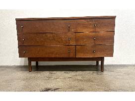 This dresser was manufactured in the early 1960s by Stanley Furniture. It has a unique history, coming from an apartment complex in Berkeley where the owner rented out furnished units to UC Berkeley students from 1963 to 1985. In 1985, when furnished apartments were no longer in demand, the owners stored all the furniture in the building's basement.