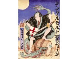 Distiller Lance Winters did the art direction for the label, which re-imagines the legend of St. George as a samurai. The original watercolor on the front label was by Oakland artist and Kala Board Member Sylvia Solochek Walters, done to emulate woodcut. The calligraphy was done by Eri Takase of Takase Studios.