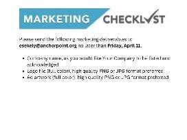 Please send the following marketing deliverables to UPDATE no later than UPDATE