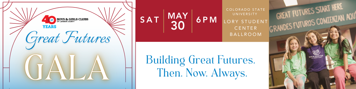 Join us for an unforgettable evening as we honor 40 years of building great futures and the thousands of young people whose lives have been shaped by our Clubs. Dress to impress in your favorite cocktail attire and enjoy an elegant evening featuring live music, dinner, complimentary drinks, and a dynamic auction. The evening will also include recognition of our Youth of the Year and the presentation of the Champion for Children Award, recognizing extraordinary individuals whose leadership and impact embody the mission of Boys & Girls Clubs of Larimer County.