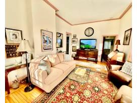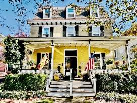 This beautiful, historic home has a total of 5 bedrooms, and 5 full baths. First-floor bedroom/full bath, large porch, back deck, huge private yard, and parking! Three blocks to the beach and promenade! Walking distance to all Cape May has to offer. Enjoy ocean breezes on a large front porch, comfortably furnished with two seating areas for relaxing and entertaining. Enjoy the large dining room table for family meals, puzzles, and game nights. The comfortably furnished family room leads to a full bath with a new claw foot tub, original pocket doors, with a first-floor bedroom with a queen bed.