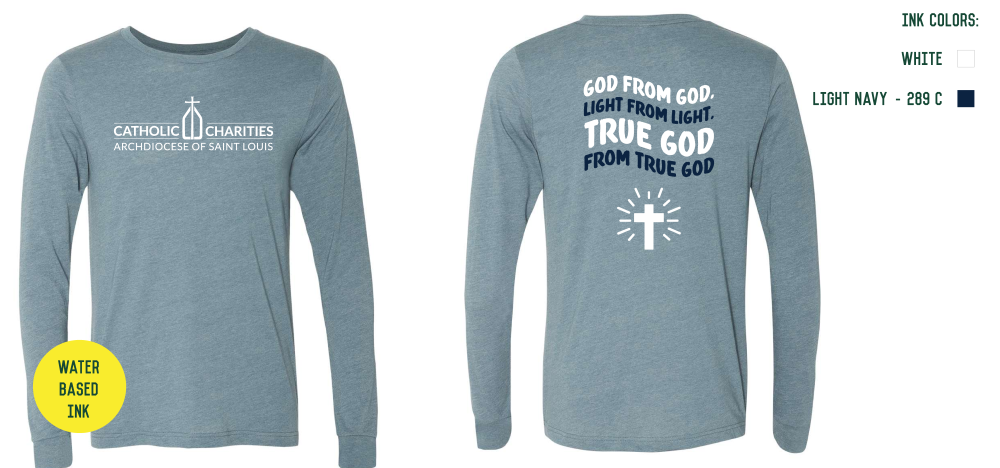 Show your faith and support in style with our ultra-soft long sleeve tee, designed exclusively for Catholic Charities of the Archdiocese of Saint Louis. This comfortable, heathered blue Bella-Canvas shirt features the Catholic Charities logo on the front in crisp white, while the back boldly proclaims a powerful line from the Nicene Creed: