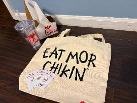 Enjoy the perfect pairing of savory and sweet! This delicious package includes a Chick-fil-A themed bundle featuring a reusable cup, canvas tote bag, and three meal coupons (an estimated $50 value) from Chick-fil-A.
