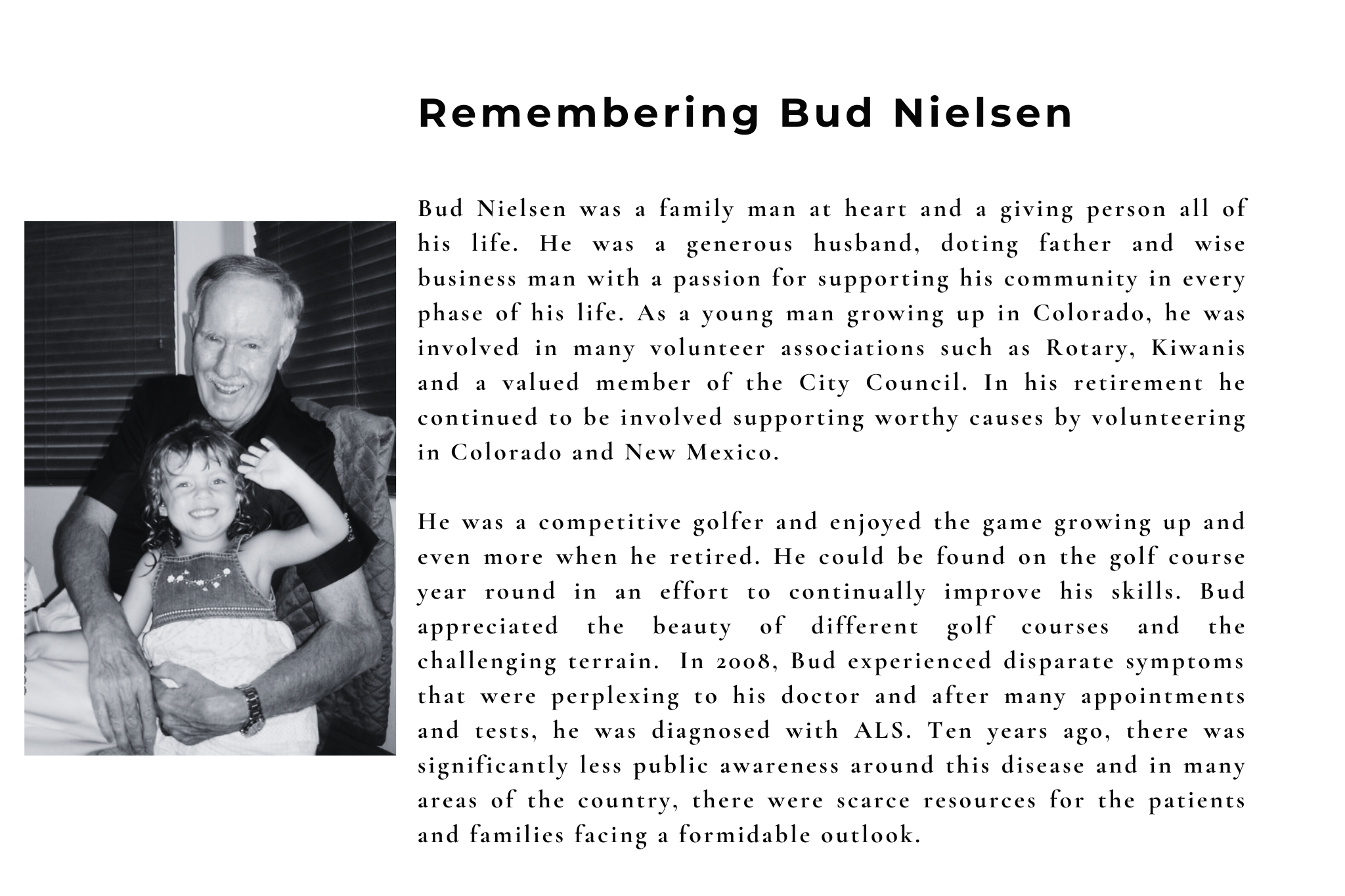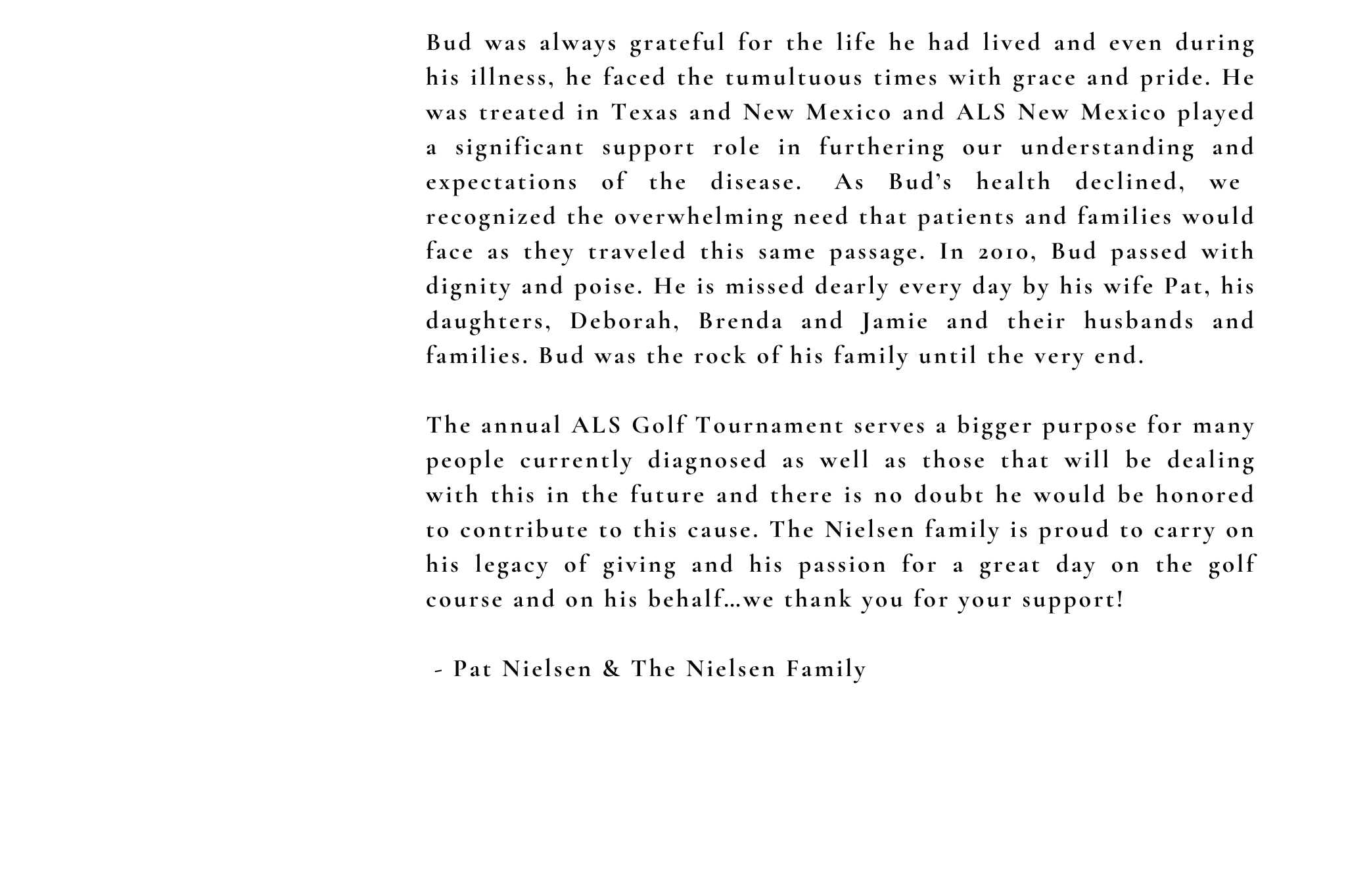Bud's strength, generosity, and love for the game continue to inspire this event. Every swing, putt, and shared moment helps raise awareness and critical funds for those living with ALS and the programs that support them across New Mexico. Whether you're playing, sponsoring, or cheering from the sidelines, your participation helps drive hope, advance care, and support families affected by this disease.