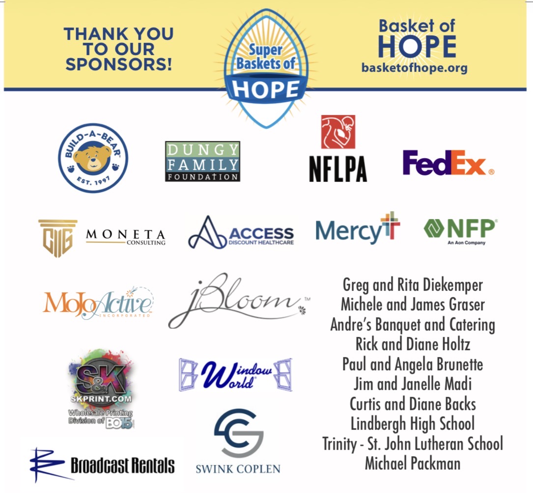 VIEW ITEMSJoin us in Giving Hope to all 32 NFL city hospitals during the weeks leading up to the Super Bowl as we deliver 12,000 gifts to families with sick children Through the personal delivery of Basket OF Hope gifts filled with games, toys, craft items, and educational materials. Parents are offered a Basket OF Hope tote filled with items to nourish them physically, emotionally, physically and spiritually. these gifts are personally delivered by members of the NFLPA, current pro football players, cheerleaders, and mascots to bring the excitement of the Super Bowl to every NFL city. Thes local celebrities are letting families know that they are not alone, the community cares for them and we are praying for them. You can help by donating any amount or bidding on auction items. Every donation will help us reach our goal of $500,000 raised to cover the cost of ingredients and to help us continue this mission for years to come.