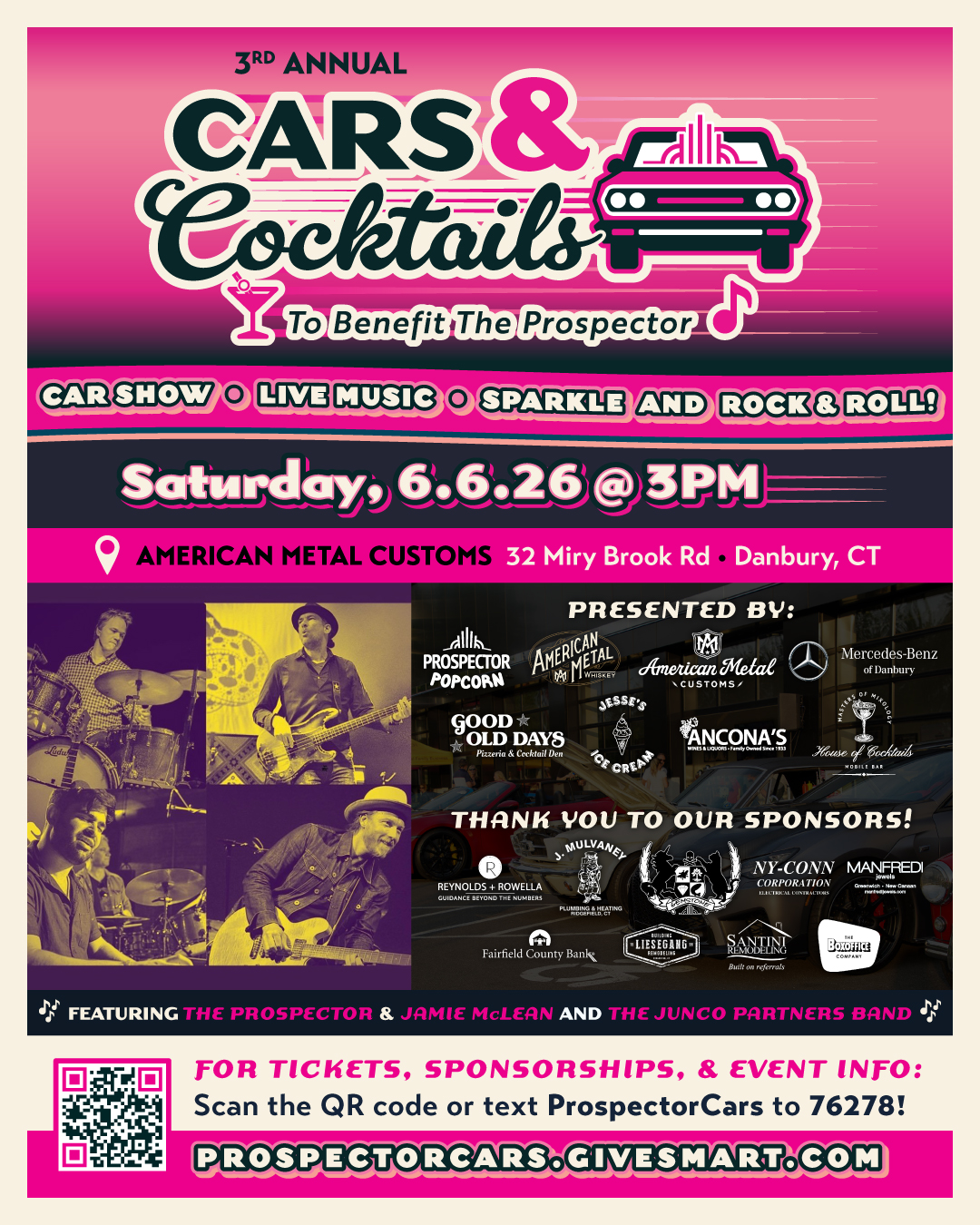 Our Annual Cars & Cocktails fundraiser to benefit The Prospector returns to American Metal Customs on June 6th for an afternoon of incredible cars, entertainment, and plenty of Prospector sparkle.