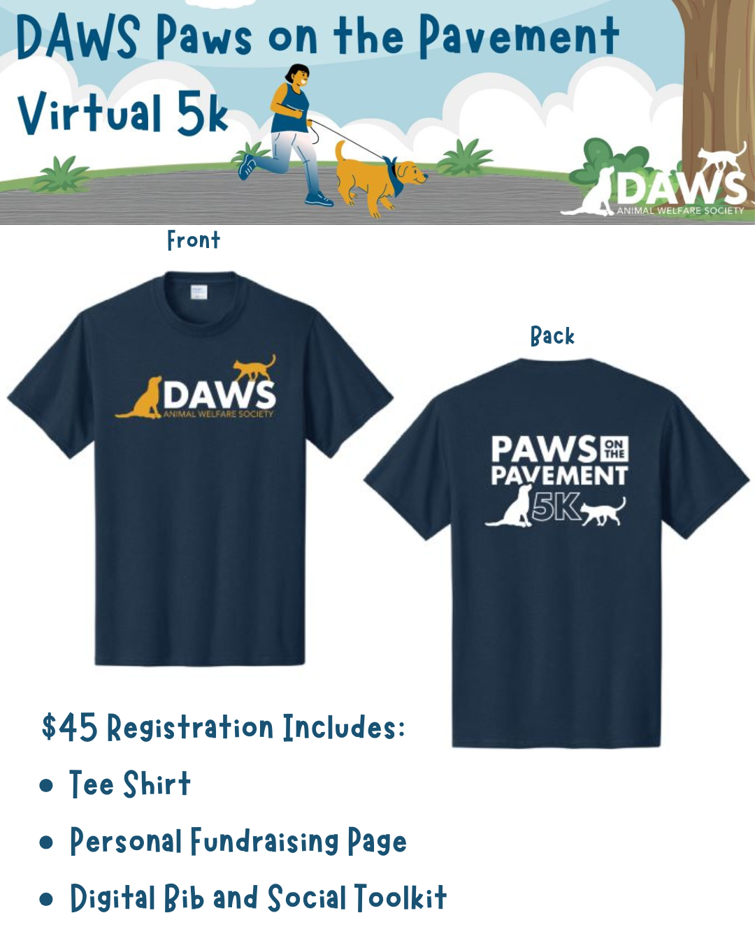 Your $45 registration includes an official DAWS 5K T-shirt and digital media package including digital bib which will be sent after registration is processed. Visit us any time Monday-Sunday from 10-4 to pick up your DAWS Virtual 5K tee shirt!