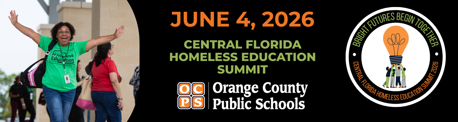 On June 6, 2026, Orange County Public Schools will host the 6th Annual Central Florida Homeless Education Summit. The Summit focuses on building awareness among educators and community agencies in Orange, Osceola, and Seminole counties about homeless education law, rights, and resources to support our neediest student population. Training in homeless education programs is the first and one of the most impactful steps to ensure our students have stability in education, even when stability at home is impossible.